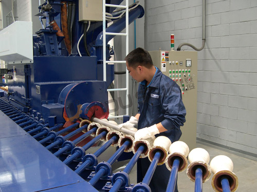 工作原理:是指通過機械的方法把丸料(鋼丸或鋼砂)以很高的速度和一定的角度拋射到工作表面上,讓丸料沖擊工作表面,然后在機器內部通過配套的吸塵器的氣流清洗,將丸料和清理下來的雜質分別回收,并且使丸料可以循環使用的技術,通過專門針對管材輸送研發的輥道機構自動輸送管材,使管材邊勻速旋轉邊勻速通過拋丸清理區,從而達到均勻的加工清理目的。