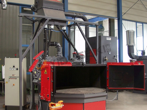 工作原理:是指通過機械的方法把丸料(鋼丸或鋼砂)以很高的速度和一定的角度拋射到工作表面上,讓丸料沖擊工作表面,然后在機器內部通過配套的吸塵器的氣流清洗,將丸料和清理下來的雜質分別回收,并且使丸料可以循環使用的技術,通過專門針對工件設計的轉臺運載工件,攜帶工件在拋丸清理區公轉或自轉通過,從而達到均勻的加工清理目的。